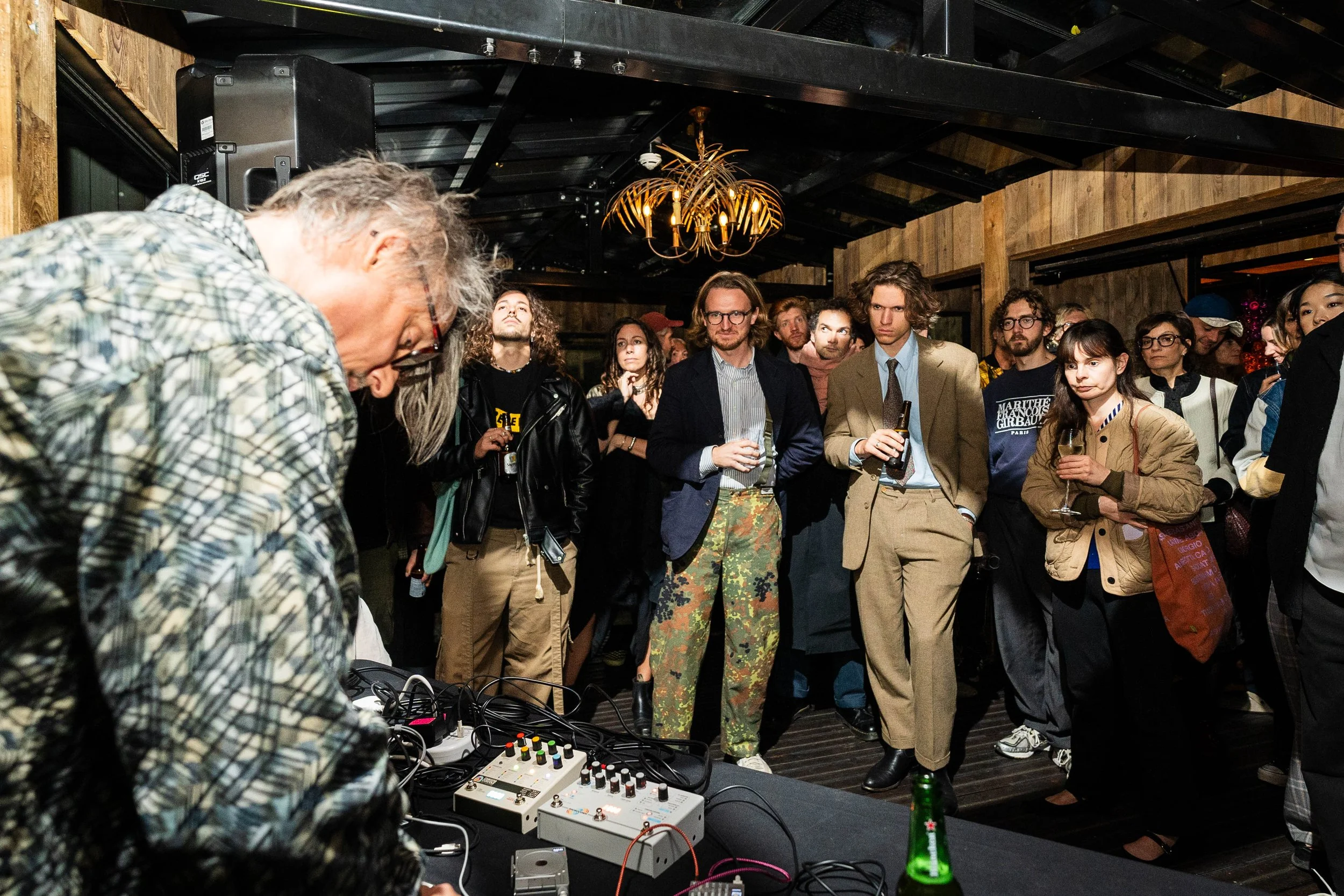 Eddie Ruscha with Peter Zummo, performance during Ruscha's "Sound / Waves" exhibition at Cedric Bardawil Gallery, London; 2022